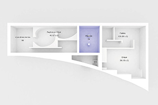| 本展覧会のスペースは、シャガール絵画における空間的特徴を抽出して構成しています。 ”死せる魂” ミクロやマクロな視点が次々に展開する様は、縦長の空間や、開かれた空間を作ることで、構図の面白さを追体験できるようにしている。