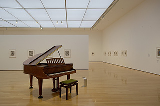 ”サーカス” サーカステントのような開かれた明るい空間に、絵の中のキャラクター達が浮かび上がるよう展示され、その中心には、エラールのピアノがおかれ、絵の世界観を体感できるように考えている。 |