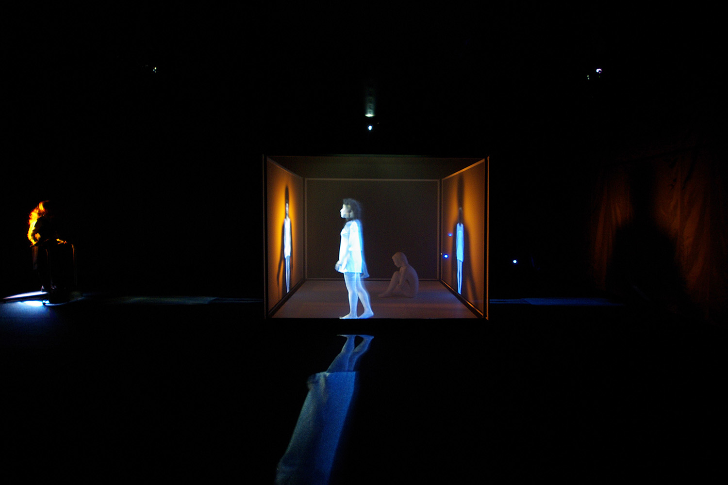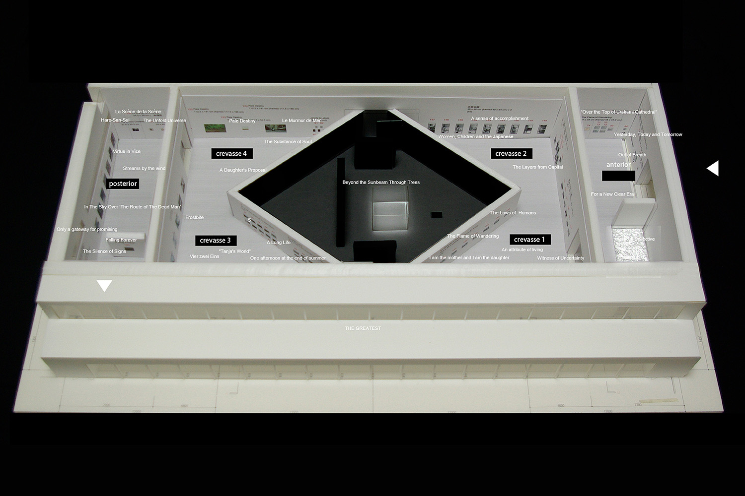 2011年5月にはじめてこのインスタレーションを、YCAM/山口情報芸術センターにおいて発表したときに平川は、会場を作成するスタッフに言い放った。 その闇の空間は、当初18m角の正方形として展示空間に置かれた。しかし生成の過程で、正方形は徐々に形をかえ、平川の覗く眼差し=ファインダーの中の世界のように、エッジを研ぎ澄ましたダイヤ形となって内包された。 |