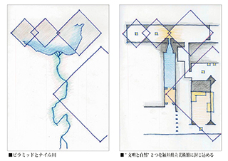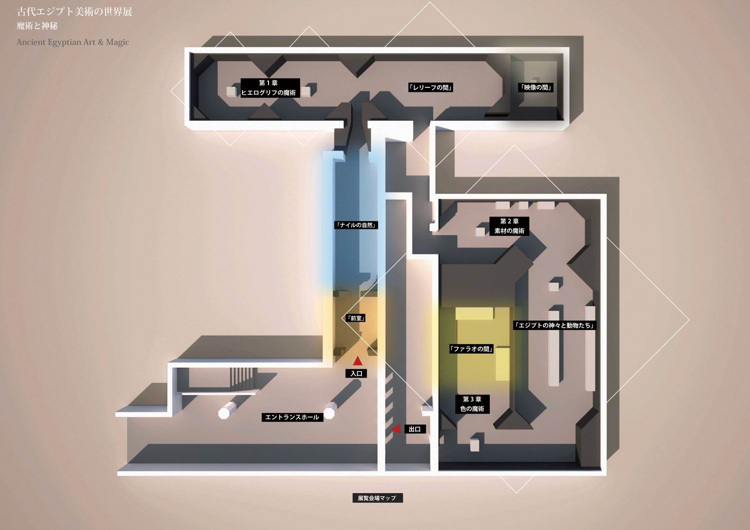 本展覧会では、ナイルの自然を表現したアプローチを抜け、巨大神殿に見立てられた美術館の展示スペースへと進むといった構成としています。それは古代エジプト人の生活や思想と切りはなすことのできない”自然と文明”という2つの概念(コンセプト)を、調和させ連続させるといった考えをベースにしています。